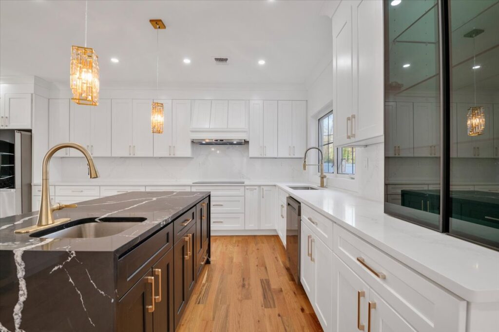 showcasing a waterfall stone island with a matching full-height backsplash—an entertainer’s dream. Five generous bedrooms and seven elegant